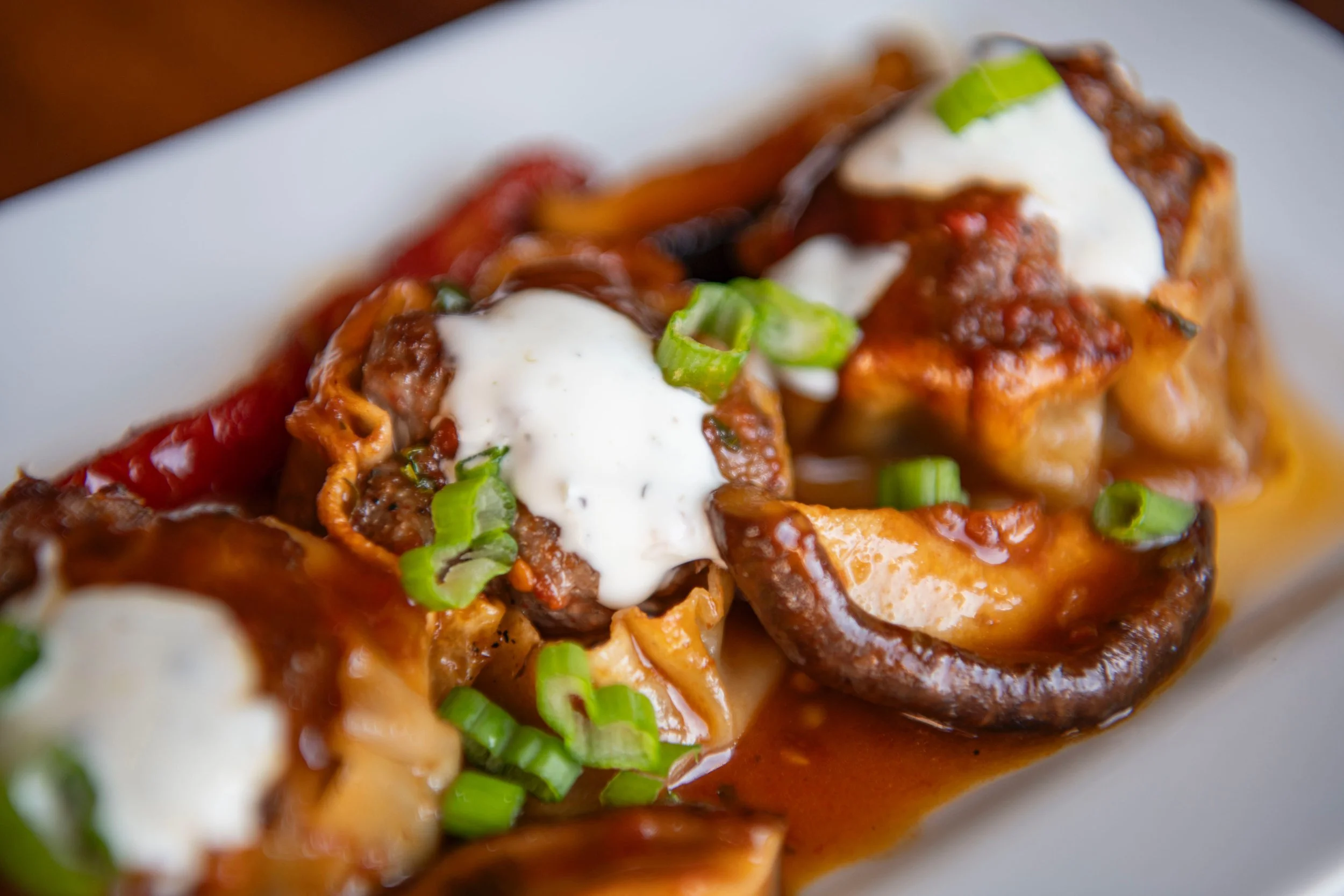 veal dumplings, oyster mushrooms, sun-dried tomato, sherry sauce, mint yogurt