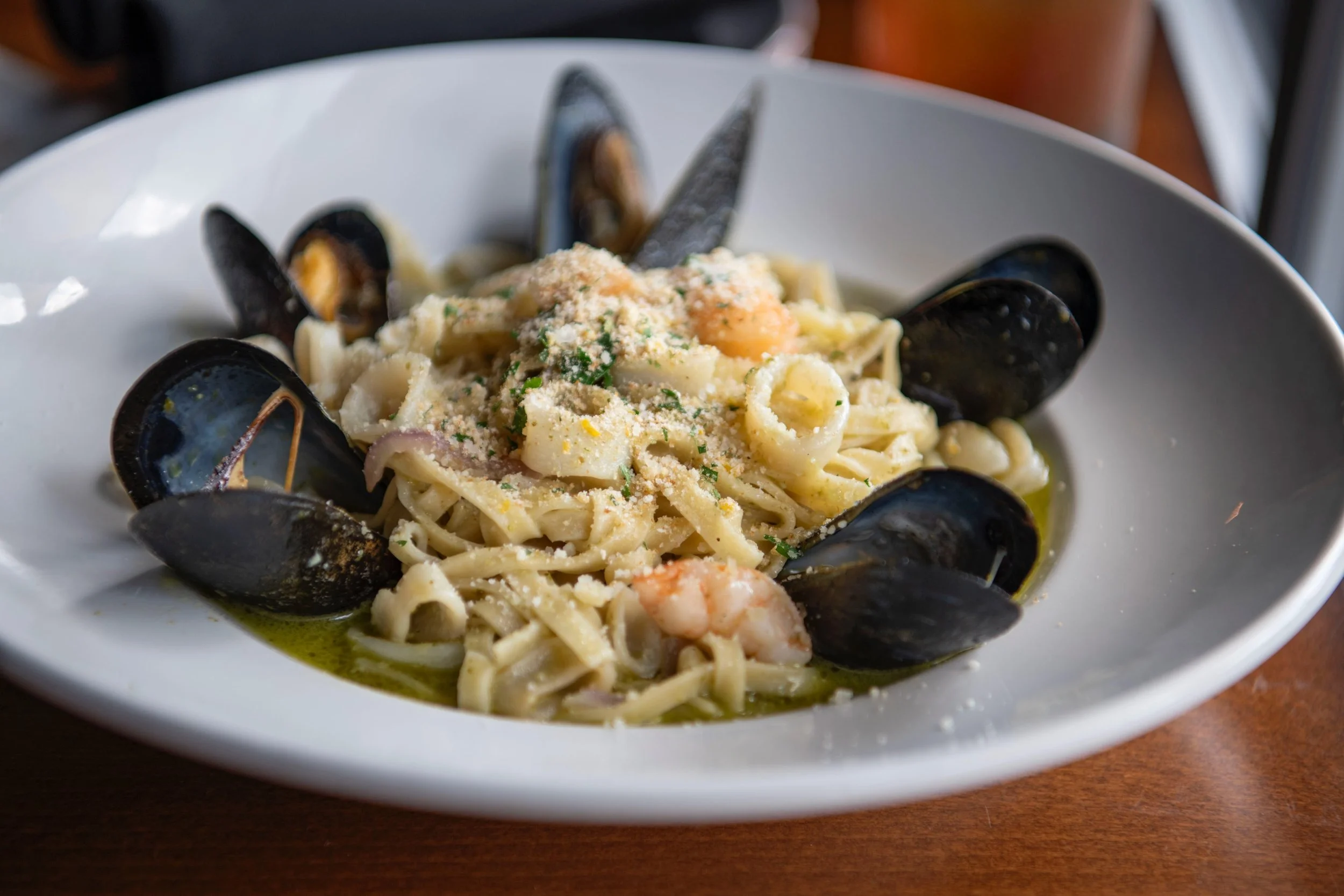 fresh linguine pasta. mussels in the shell, garlic shrimp. scallops, calamari, sauteed shallots. tossed in a white wine pesto sauce with citrus gremolata